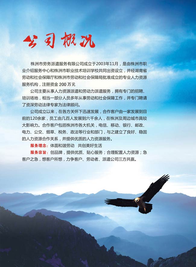 服務(wù)宗旨:創(chuàng)品牌,提供優(yōu)質(zhì)、貼心服務(wù);合理配置人力資源;急客戶之急,想客戶所想,力爭客戶、勞動(dòng)者、派遣公司三方共贏。